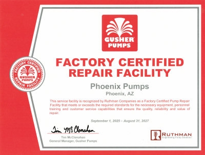 Phoenix Pumps is proud to be the exclusive factory certified service center for Gusher Pumps in Arizona, a trusted name in industrial pump solutions. As an official partner, Phoenix Pumps provides expert maintenance, repair, and support services to ensure optimal performance and longevity of Gusher Pumps products. Customers can rely on our certified team for quality service backed by manufacturer-approved standards and genuine parts.
